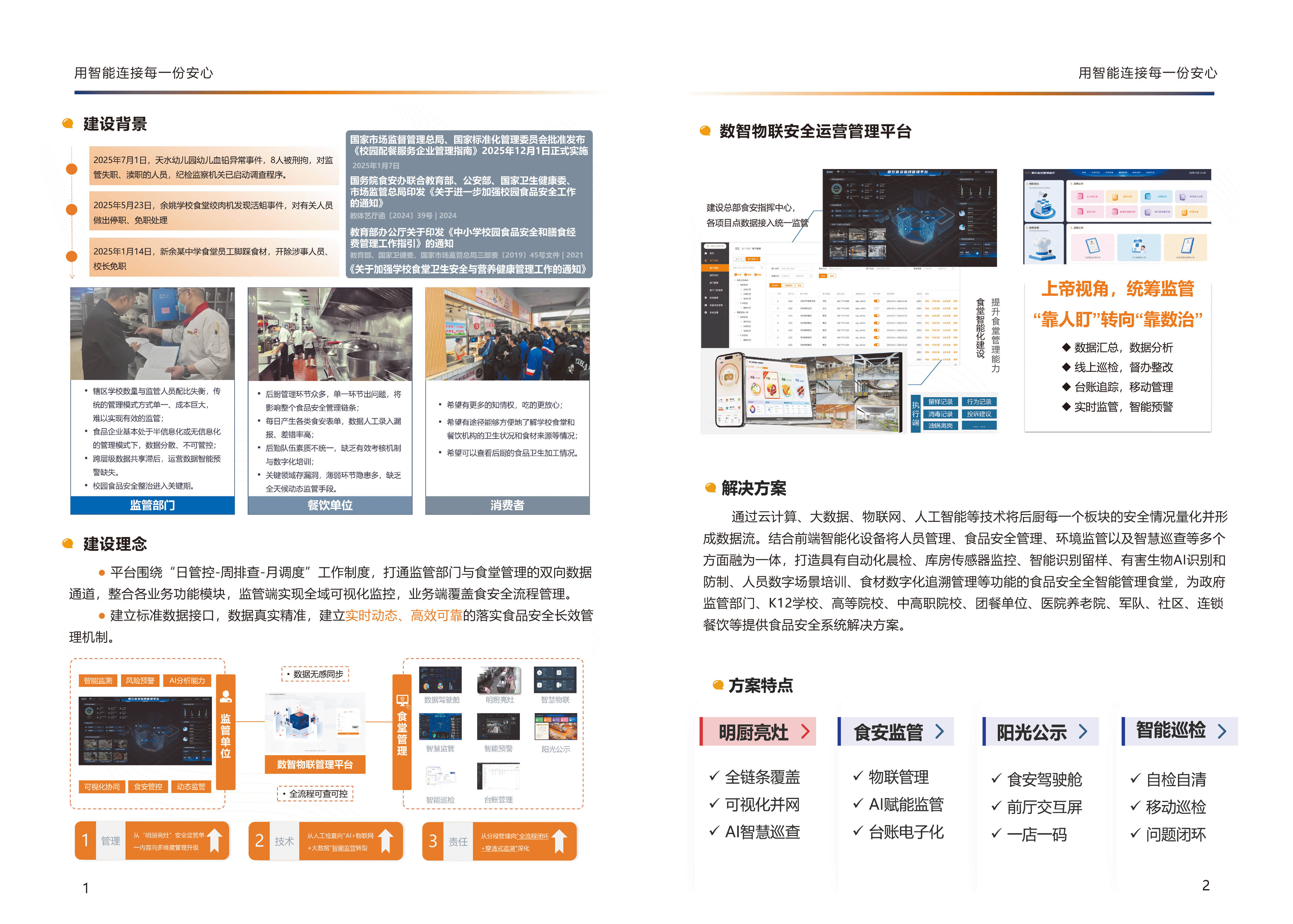 消息化高校聪慧食安处理方案具有很多显著特点。起首是数据集成取共享。它可以或许整合学校各部分、各环节的食物平安数据,实现跨层级的数据共享,打破消息孤岛,让监管人员和学校办理人员可以或许及时、精确地控制食物平安情况。其次是智能预警功能。系统能够按照预设的法则和算法,对食物平安数据进行阐发和预警,一旦发觉非常环境,当即发出警报,提示相关人员采纳办法,无效防止食物平安变乱的发生。此外,该处理方案还供给便利的查询和逃溯功能,消费者能够通过手机APP等体例,便利地领会学校食堂和餐饮机构的卫生情况、食材来历等环境,满脚了消费者对食物平安知情权的需求。