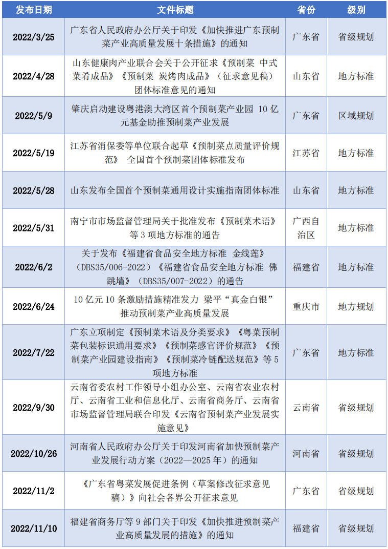 环绕预制菜,山东多个地市纷纷制定步履打算和财产政策。2022年4月,潍坊出台《潍坊市预制菜财产高质量成长三年步履打算(2022—2024)》和《潍坊市支撑预制菜财产高质量成长九条政策办法》;2022年6月,印发《关于加速推进预制菜财产成长的若干办法》;2022年6月,出台《市预制食物财产成长规划》。